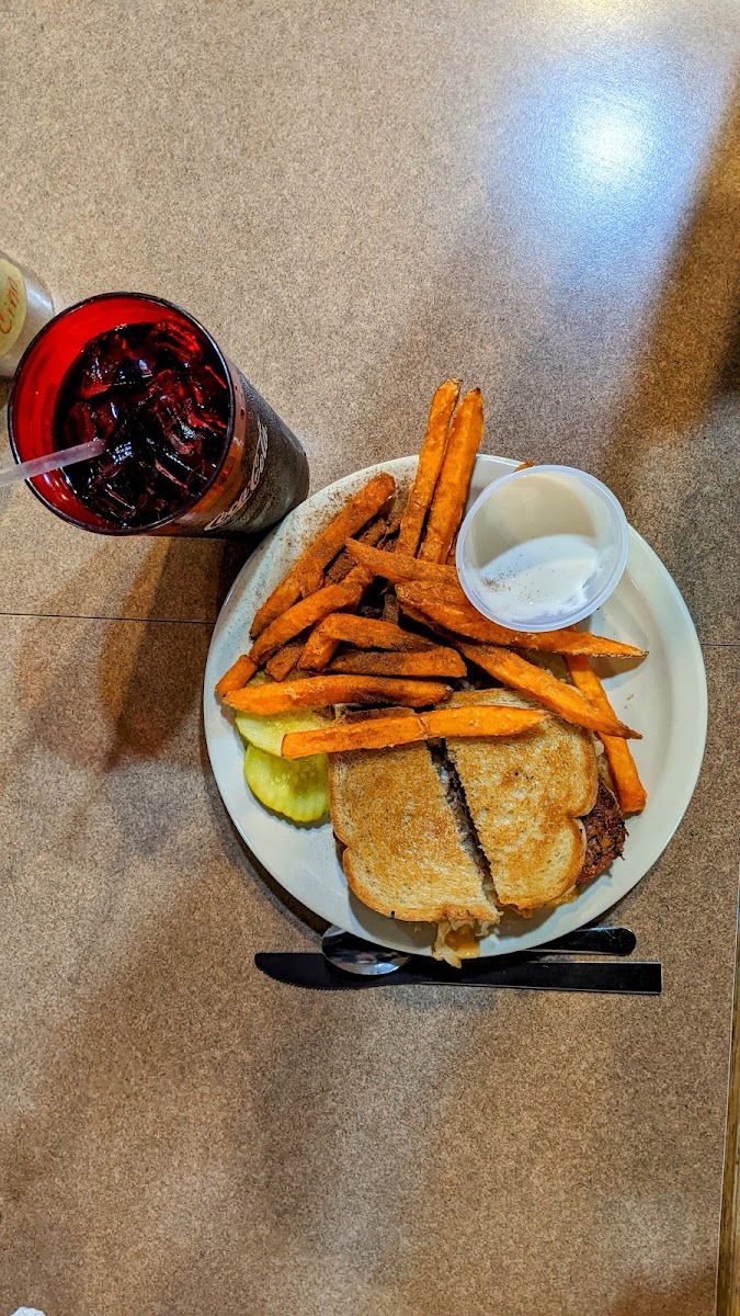 Got Root beer as a drink. They serve coke products. The ruben sandwich as the main meal which consisted of corned beef, thousand island dressing, and sauerkraut on rye bread. The corned beef was less processed than I'm used to as I could actually tell it was beef which was a nice change. It came with two dill pickles on the side and sweet potato fries accompanied by a cinnamon shaker and marshmallow dipping sauce on the side as well which was suggested by the waitress. Speaking of which the staff here was great, personable, and friendly!